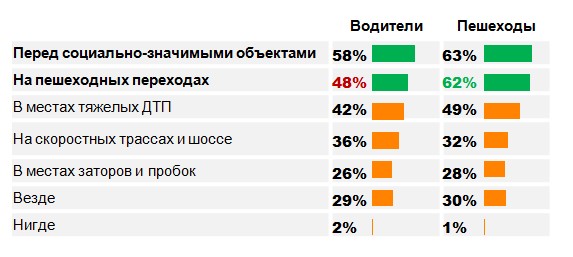 Что касается отношения к камерам ФВФ в целом, большинство опрошенных, как водителей, так и пешеходов, считают их эффективным способом контроля за скоростью (так считают 68% респондентов в Москве и 58% в Подмосковье). При этом их необходимо устанавливать не только в очагах ДТП (43% опрошенных в Москве, 48% - в МО), как это делается сегодня, но еще и перед социальными объектами (59% Москва, 62% - МО) и пешеходными переходами (51% - Москва, 59% - МО), а также в местах, где регулярно наблюдаются тяжелые ДТП, на скоростных трассах и шоссе (37% и 30% соответственно). Примечательно, что 30% респондентов в Москве и 29% в Московской области считают, что камеры должны устанавливаться повсеместно и лишь 2% и 1% соответственно считают, что камеры не нужны вовсе.