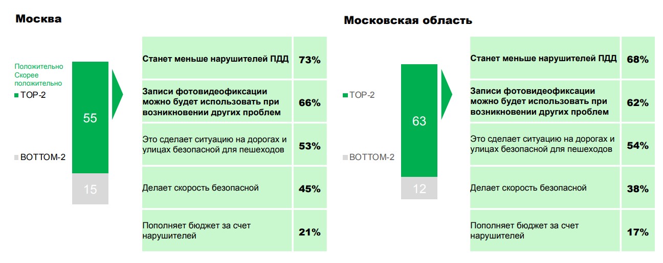 Среди эффектов, которые опрошенные ожидают от фотовидеофиксации, на первом месте - снижение количества нарушителей ПДД, так ответили 73% респондентов в Москве и 68% - в Подмосковье. Также опрошенные считают, что записи со средств фотовидеофиксации можно будет использовать при возникновении других проблем (66% в Москве и 62% в Подмосковье). Особо респонденты отметили роль ФВФ для безопасности пешеходов: 53% в москвичей и 54% жителей Подмосковья считают, что установка комплексов ФВФ делает ситуацию на дорогах и улицах более безопасной для пешеходов.