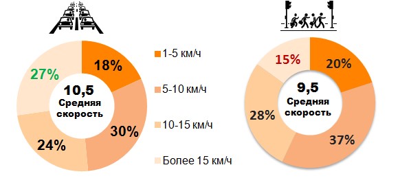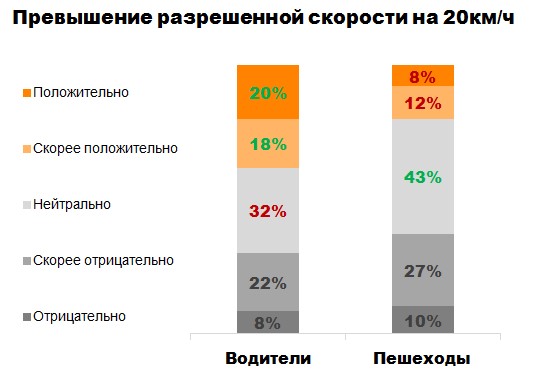По мнению опрошенных (34% Москвичей, 44% жителей Подмосковья), фактическая скорость в городах слишком высокая. Большинство респондентов не одобряют существующий установленный скоростной режим на дорогах. Две трети опрошенных отрицательно относятся к законодательно закрепленной возможности превышать разрешенную скорость в пределах 20км/ч. Допустимый порог превышения, по мнению опрошенных, в среднем должен составлять около 10 км/ч. Оптимальная разрешенная скорость для города - 60 км/ч (прим. РОМИР: сегодня с учетом нештрафуемого порога - это 80 км/ч).