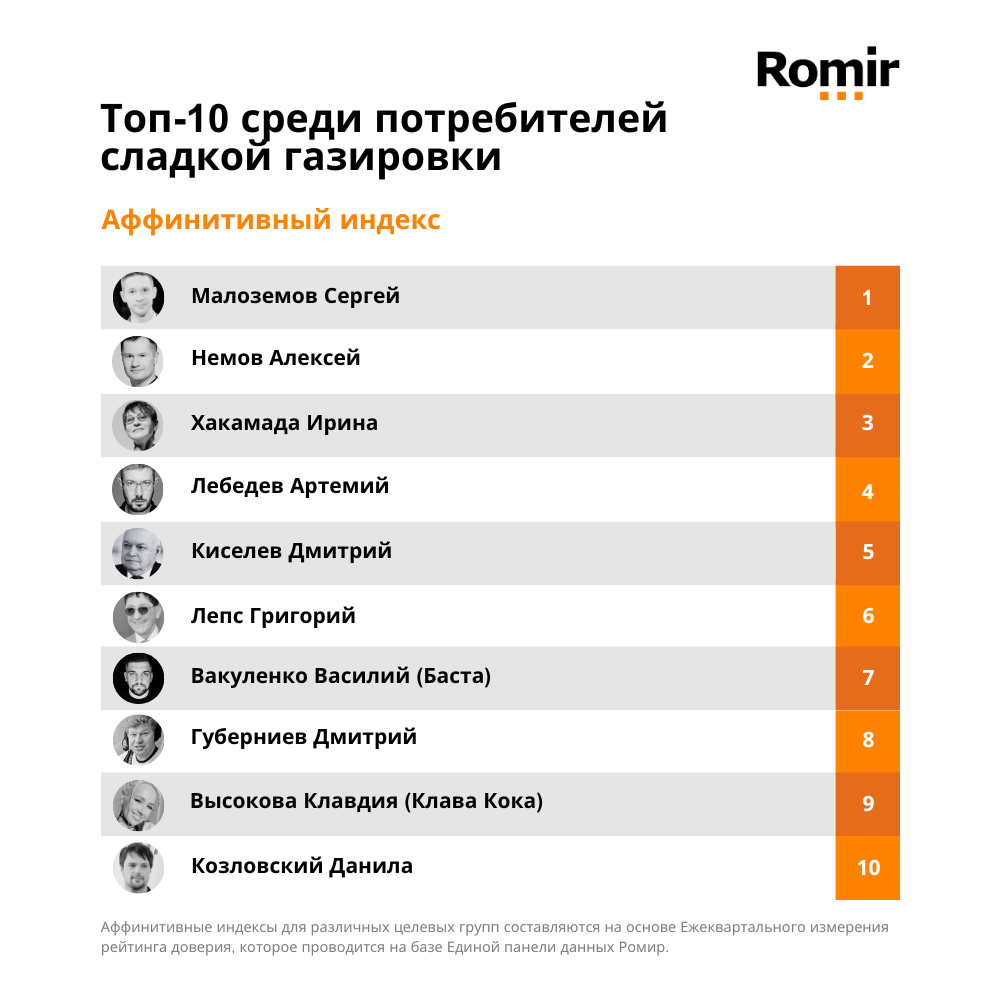 Исследовательский холдинг Ромир публикует аффинитивный индекс* для потребителей сладких газированных напитков – кому из публичных персон доверяют люди, которые регулярно потребляют газировку. Абсолютным лидером мнений в целевой группе был назван телеведущий Сергей Малоземов.