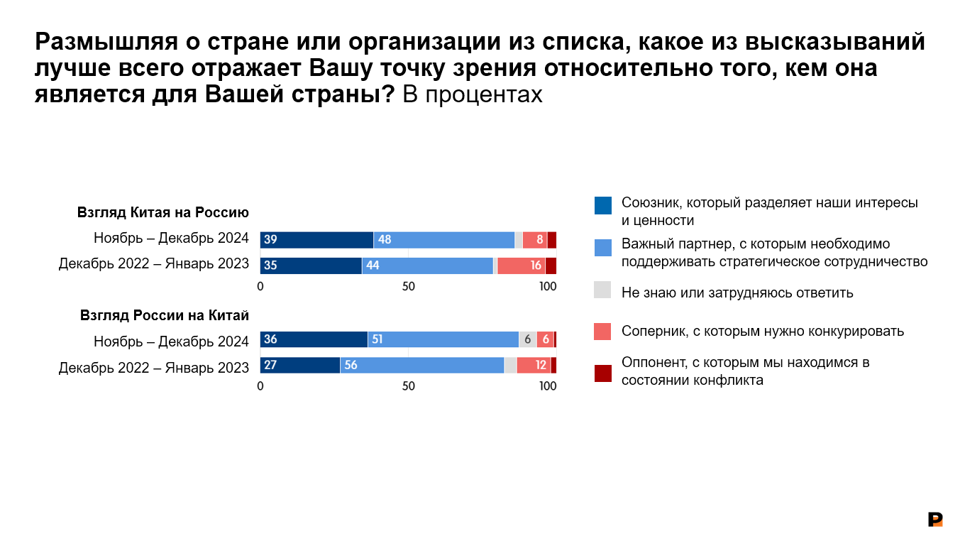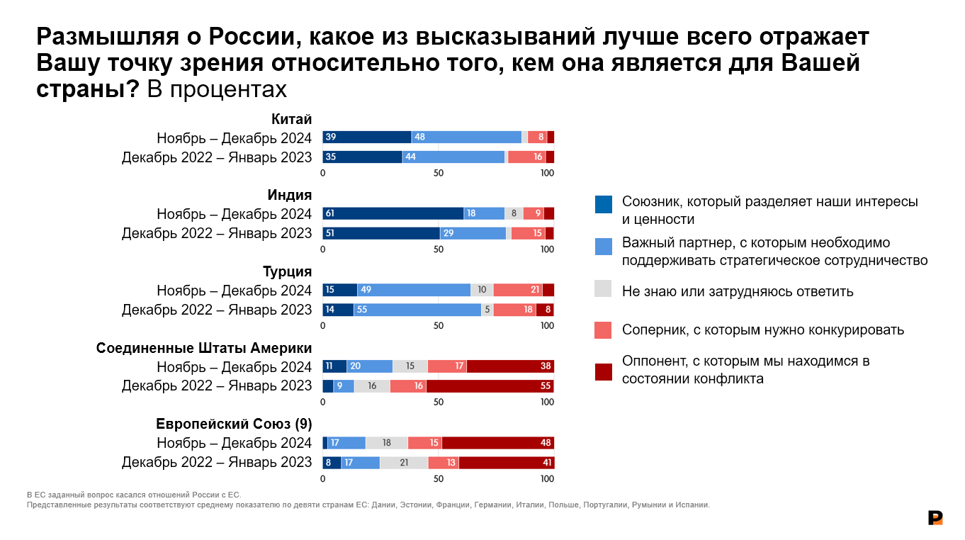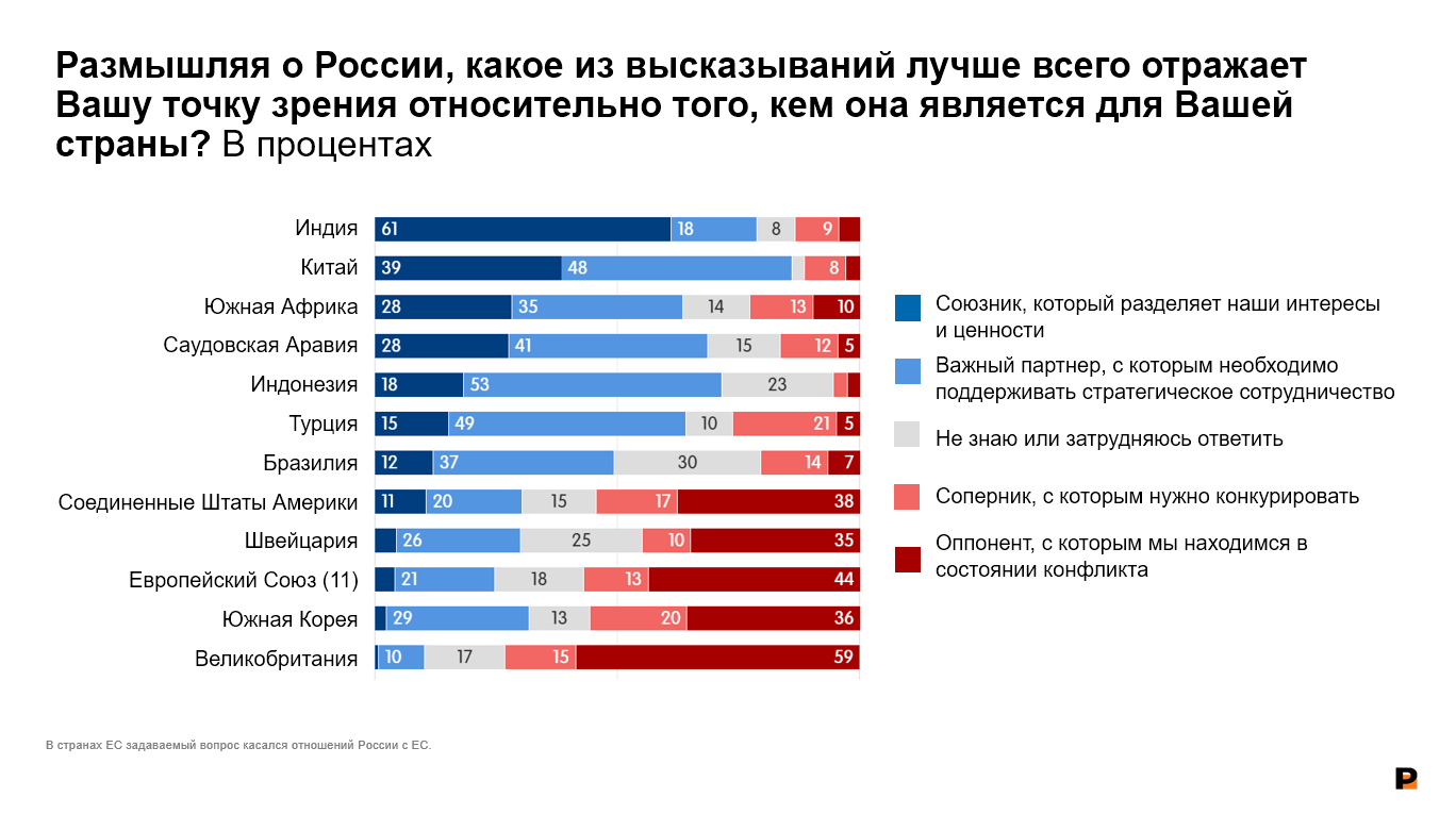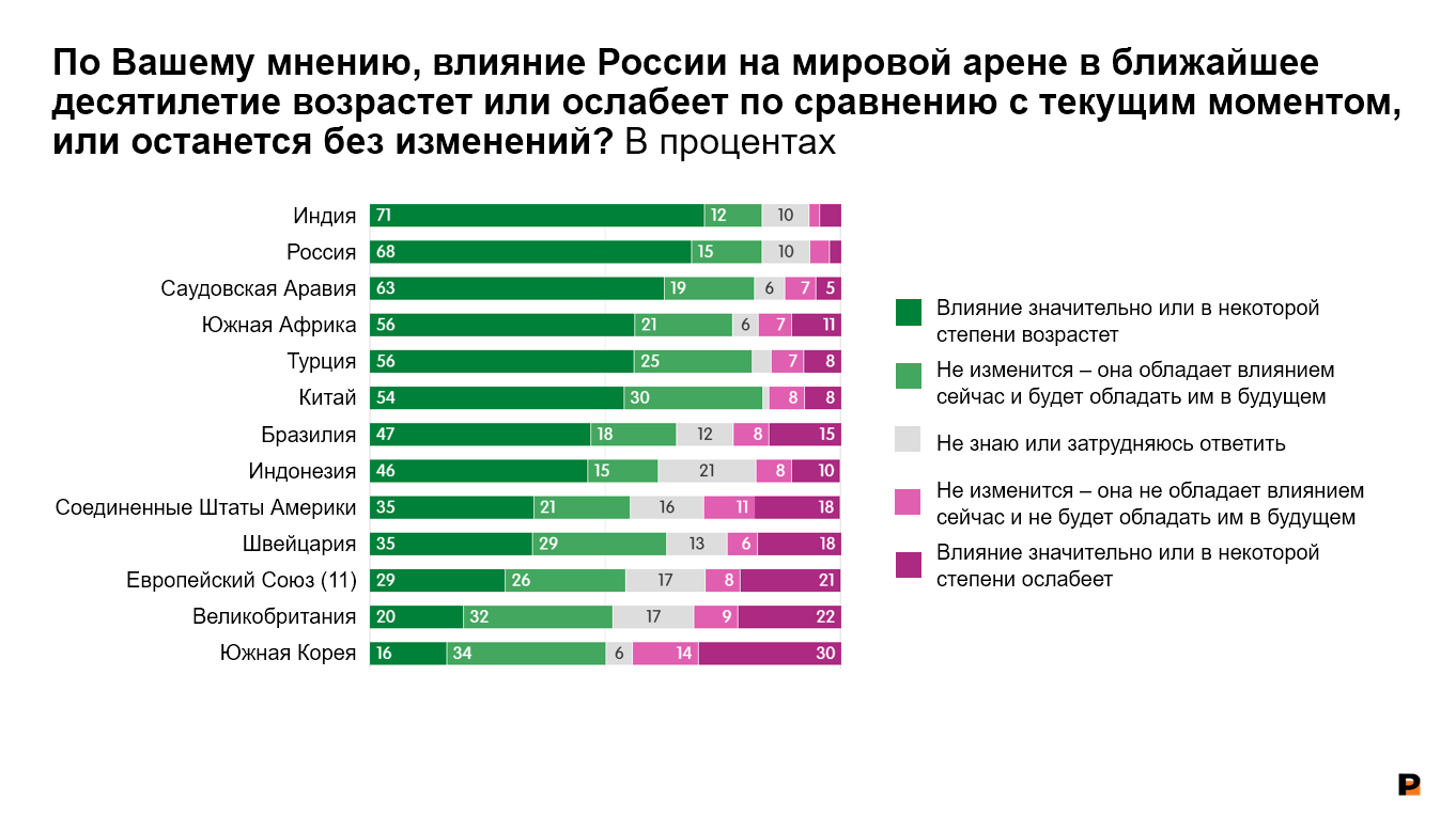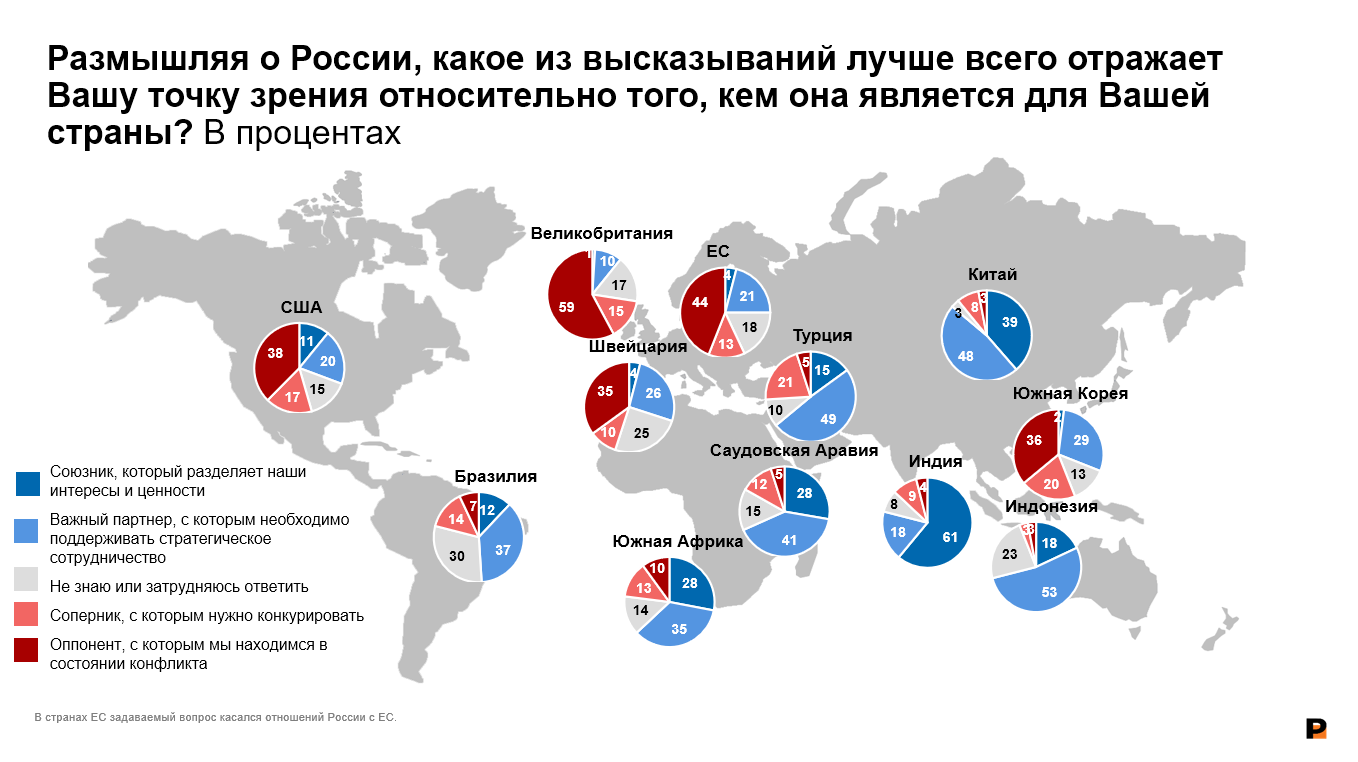 В ходе исследования респонденты выразили свое мнение о том, является ли Россия для их страны: союзником, партнером, соперником или оппонентом. Также участники исследования ответили на вопрос о влиянии России на мировой арене в ближайшее десятилетие.