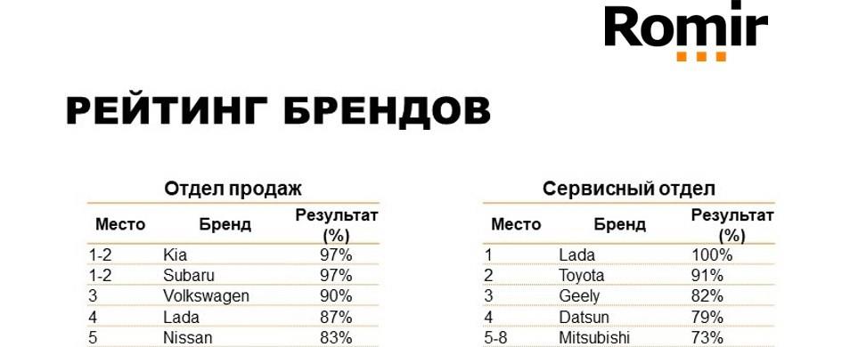 - Интересны результаты по качеству работы ДЦ с точки зрения рейтинга брендов. Лидерами по качеству отдела продаж стали бренды дилерских центров Kia, Subaru и Volkswagen. В части качества работы сервисного отдела тройка лидеров выглядит следующим образом: Lada, Toyota, Geely.
