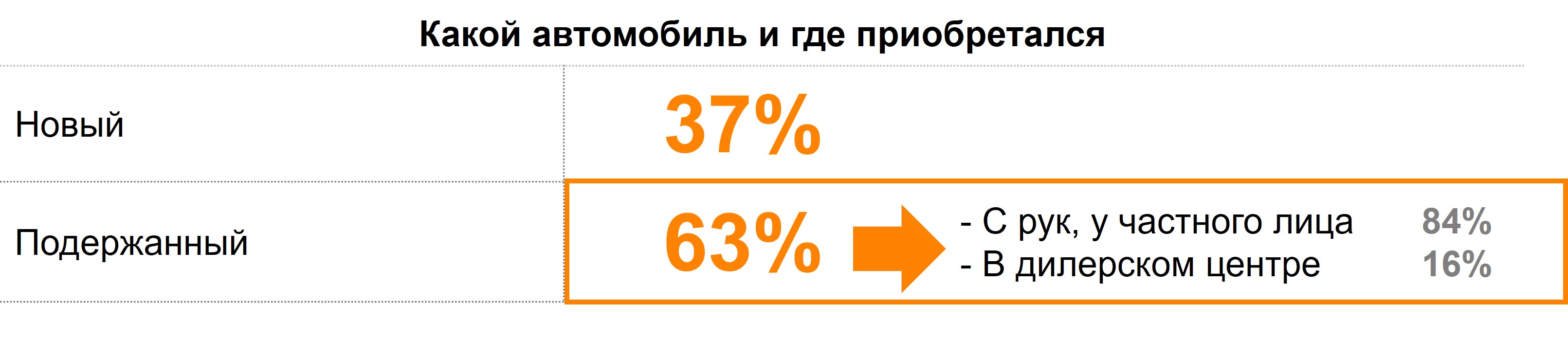 Выяснилось, что 13% респондентов приобрели автомобиль в течение года, из них 63% покупок пришлись на подержанные и 37% на новые. Покупатели подержанных автомобилей предпочитают брать авто с рук (84%). Только в 16% случаев автомобили приобреталась в дилерских центрах.
