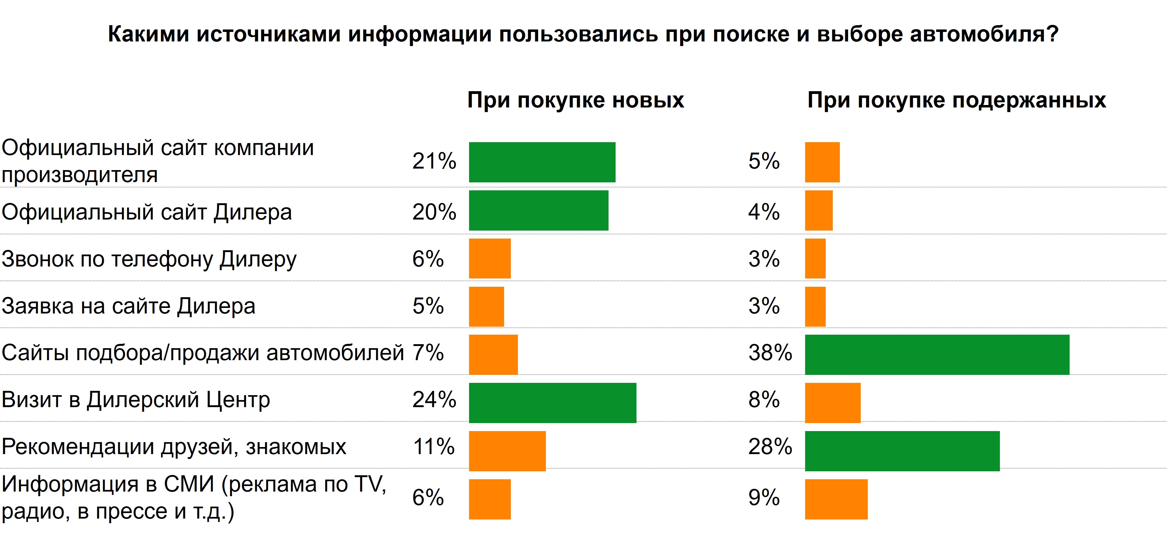 Кардинально отличается поведение при выборе нового автомобиля. Так, автовладельцы сообщили, что в первую очередь они сразу посещали дилерский центр для получения консультации (24%), в 20% случаев изучали официальный сайт производителя или дилерского центра и только в 11% прислушивались к рекомендациям знакомых. Наиболее востребованными услугами стали онлайн расчеты кредита, страховки и онлайн-конфигуратор – ими воспользовались 50% и 26% респондентов.