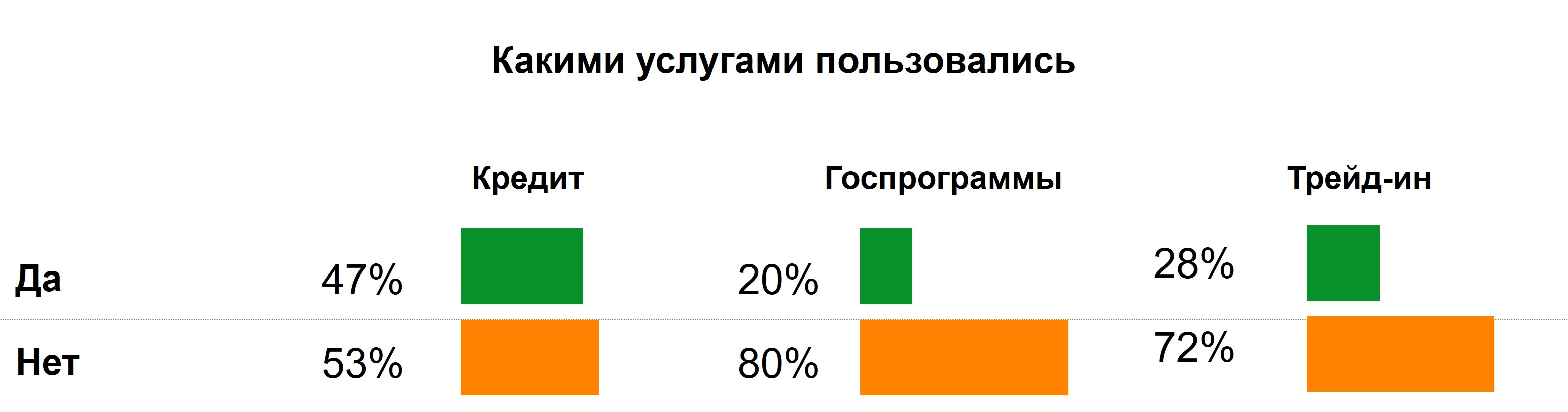 В 47% случаев автомобиль приобретался в кредит, из них в 20% с помощью госпрограммы. Наиболее популярная программа – «семейный автомобиль», ей воспользовались в 69% случаев. Владельцы предпочитают продавать свой автомобиль самостоятельно, услугой трейд-ин воспользовалось только 28% респондентов, несмотря на дополнительные выгоды от дилера при сдаче автомобиля.