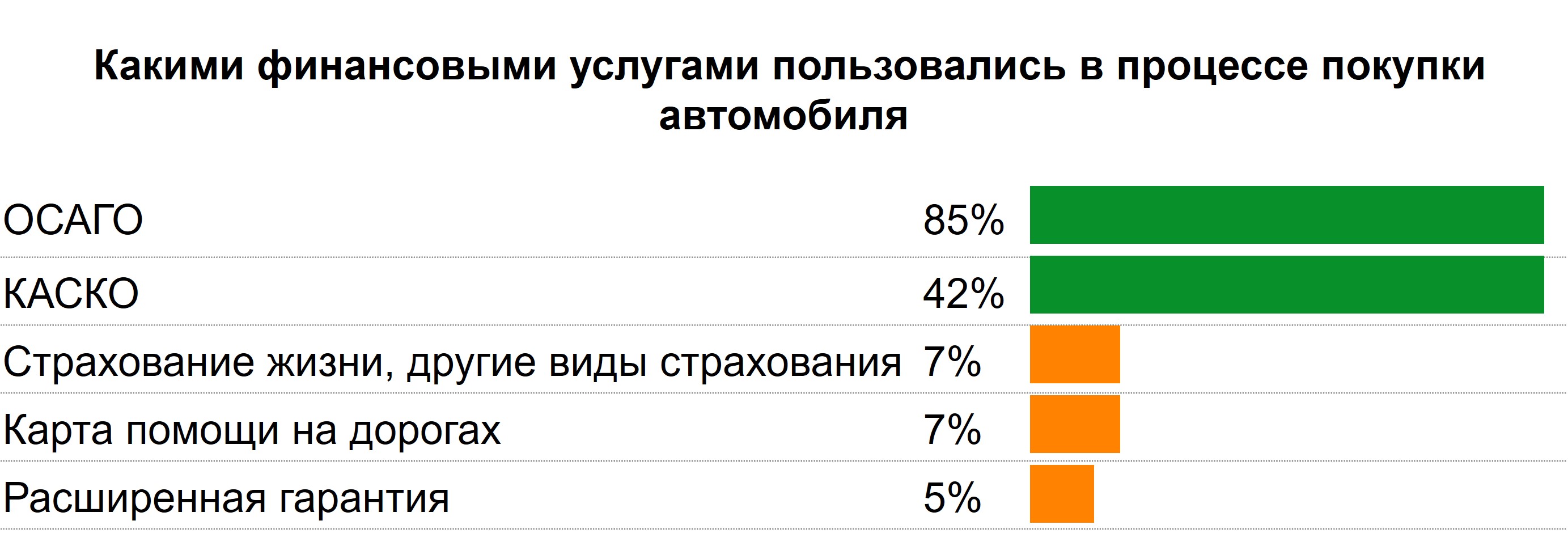 Наиболее популярными финансовыми услугами стали ОСАГО и КАСКО – 85% и 42% соответственно. Менее популярными оказались другие виды страхования (7%), карта помощи на дорогах (7%) и расширенная гарантия (5%).
