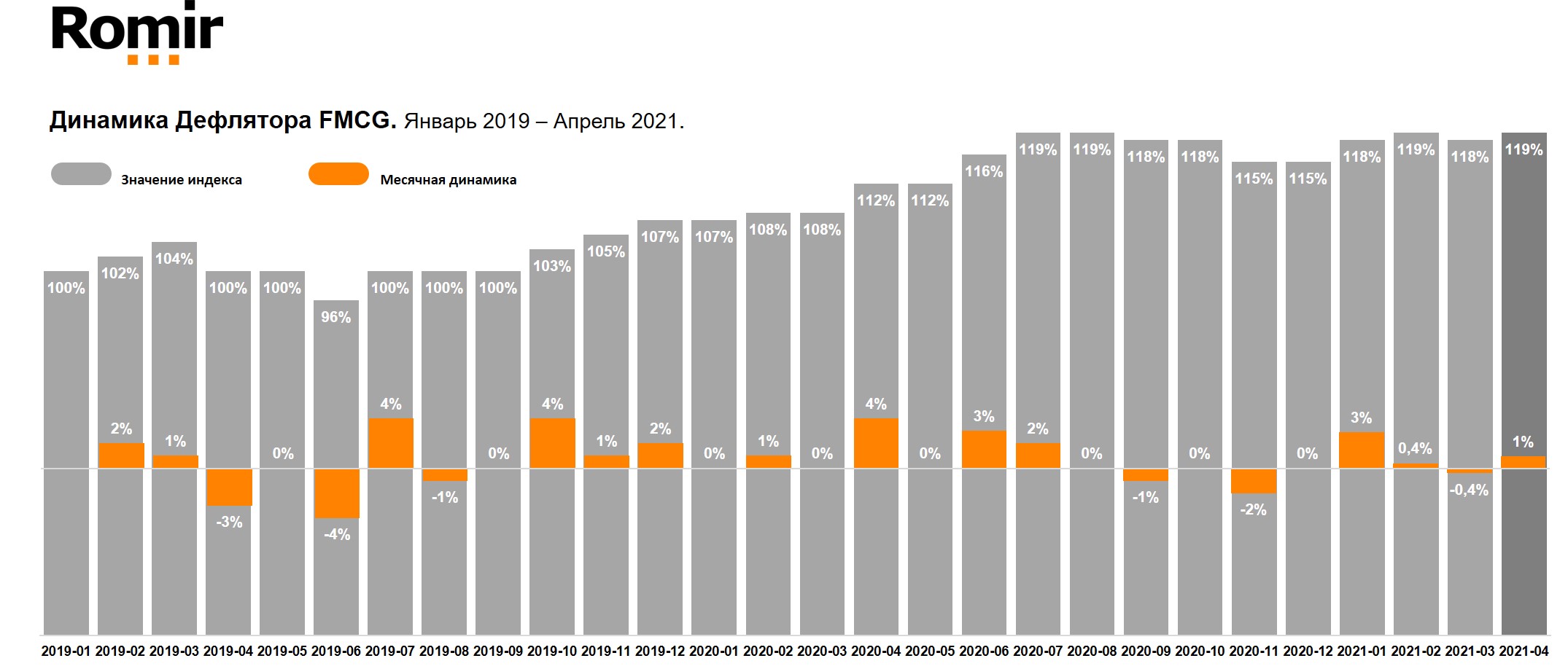 Исследовательский холдинг Ромир продолжает расчет статистического индекса Дефлятора, который отражает реальные изменения общего уровня цен на товары FMCG.
