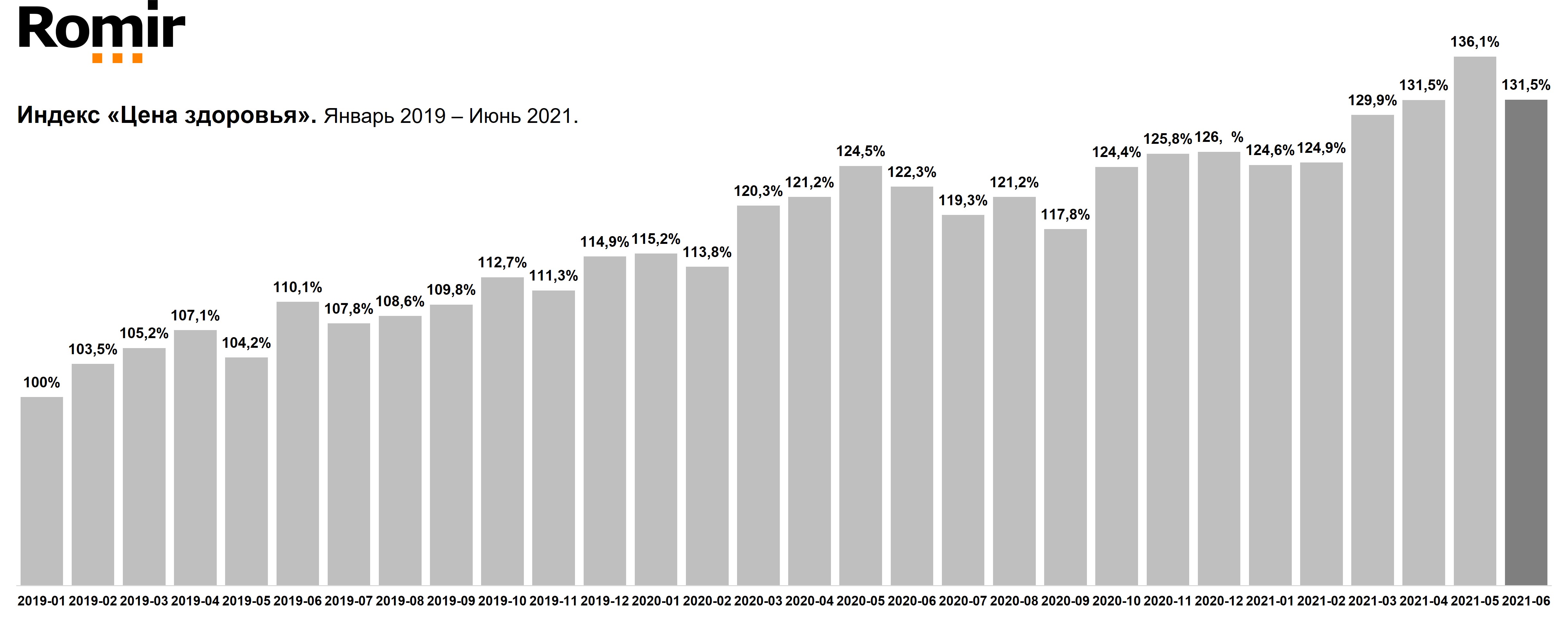 В июне 2021 года цены на лекарственные препараты сократились по сравнению с маем 2021 года на 3,4%. Это первое снижение цен на лекарства от месяца к месяцу в этом году. При этом по сравнению с июнем 2020 года цены выросли на 7,5%. Показатель января 2019 года принят за 100% – исходную точку для расчета индекса. В июне 2021 года индекс «Цена здоровья» составил 131,5%.