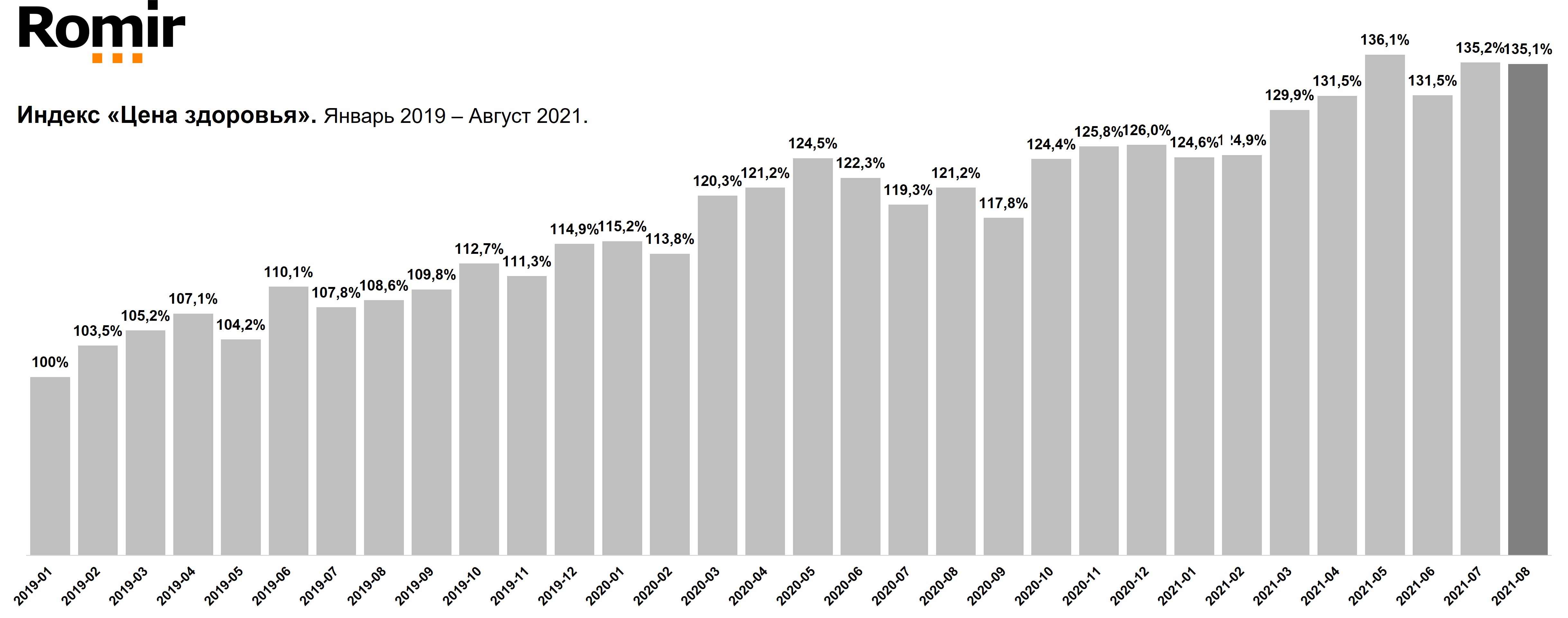 Показатель января 2019 года принят за 100% – исходную точку для расчета индекса. В августе 2021 года индекс «Цена здоровья» составил 135,1%.