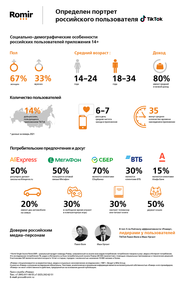«Ромир» определил на базе Romir Single Source Panel (SSP)* портрет российского пользователя TikTok. В исследовании участвовали панелисты старше 14 лет. Выяснилось, что видеоконтент приложения интересует не только подростков, но и представителей более старших поколений. Одновременно число пользователей за последний квартал 2020 года выросло почти втрое.