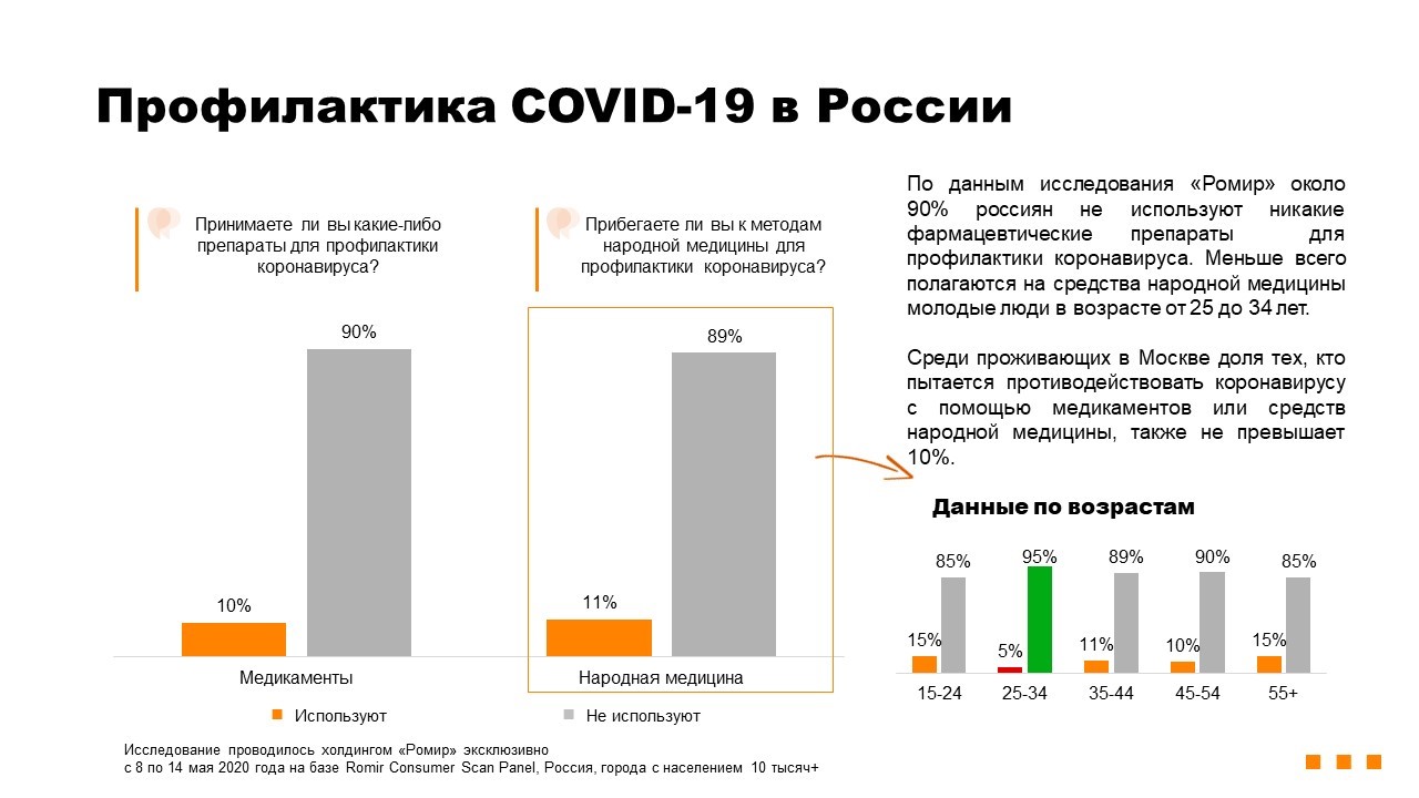 По данным исследования «Ромир», проведенного на неделе 8-14 мая 2020 г., 90% россиян не используют никакие фармацевтические препараты для профилактики коронавируса.