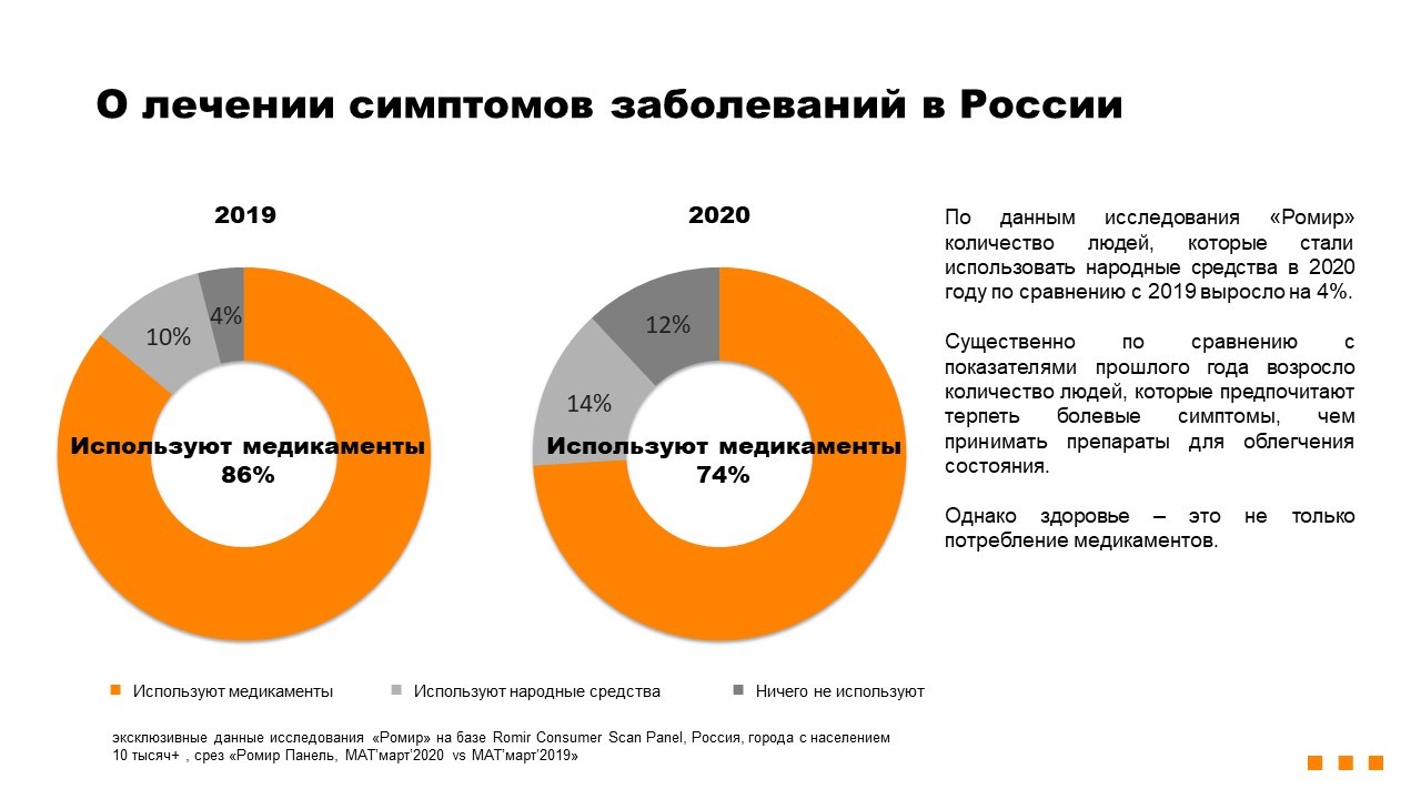 По данным исследования «Ромир» количество людей, которые стали использовать народные средства в 2020 году по сравнению с 2019 выросло на 4%.
