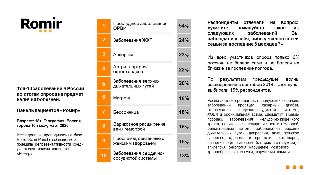 Исследовательский холдинг «Ромир» по итогам опроса на предмет наличия болезней у респондентов из панели пациентов Romir Scan Panel выделил Топ-10 заболеваний в России. Данный вид опроса проводится раз в полугодие.