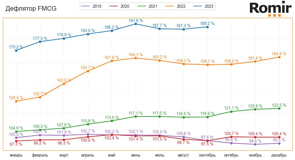 Диаграмма 1. Динамика индекса Дефлятора FMCG, (%). Январь 2019 – сентябрь 2023.