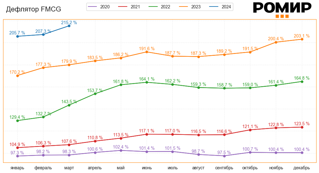 Индекс Дефлятор FMCG фактически отражает динамику цен на товары повседневного спроса, входящих в среднестатистическую корзину российских потребителей, которая значительно шире базовой, на которую ориентируется Росстат.