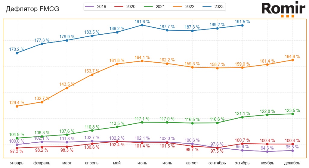 Диаграмма 1. Динамика индекса Дефлятора FMCG, (%). Январь 2019 – октябрь 2023