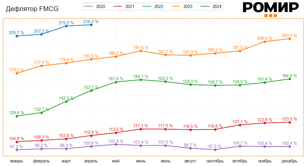 РОМИР продолжает проводить расчеты статистического Индекса Дефлятора, отражающего реальные изменения общего уровня цен на товары повседневного спроса (FMCG) за определенный период. На основе Единой панели данных РОМИР* проводится анализ информации о реально совершенных покупках по реальным ценам, поэтому Дефлятор фактически демонстрирует среднестатистическую личную инфляцию каждого потребителя.
