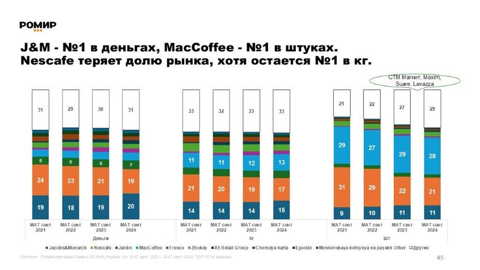 Анализ данных РОМИР за период с октября 2023 по сентябрь 2024 года свидетельствует о трансформации рынка кофе в России. Наблюдается смещение лидерства в денежном выражении: бренд Nescafe уступил позицию компании Monarch. В штучном исчислении лидерство перешло к MacCoffee. Однако, если рассматривать рынок в килограммах, Nescafe сохраняет свои лидирующие позиции.