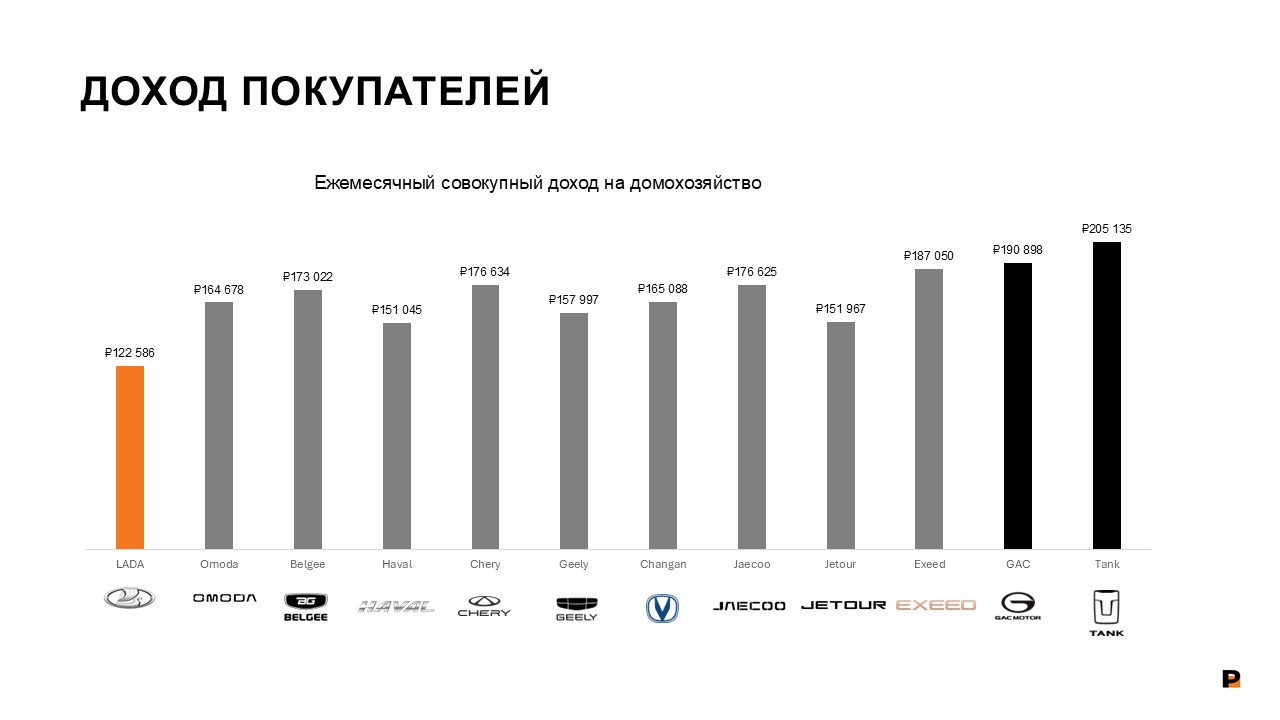Покупатели LADA демонстрируют средний совокупный доход около 122 тыс. рублей, тогда как у владельцев более дорогих марок (GAC, Tank) он превышает 190 – 200 тыс. рублей. Для массового сегмента (Geely, Chery, Belgee) характерен уровень дохода порядка 160–180 тыс. рублей.