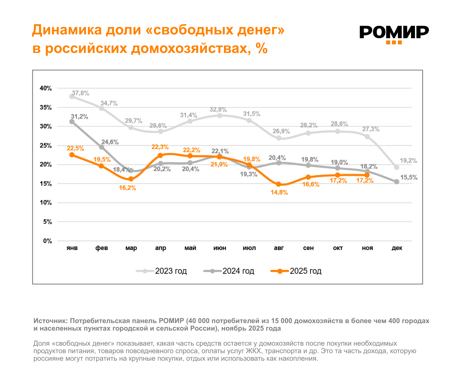 Согласно данным РОМИР, доля средств, остающихся у российских домохозяйств после закрытия базовых потребностей, в ноябре 2025 года сохранила значения октября.