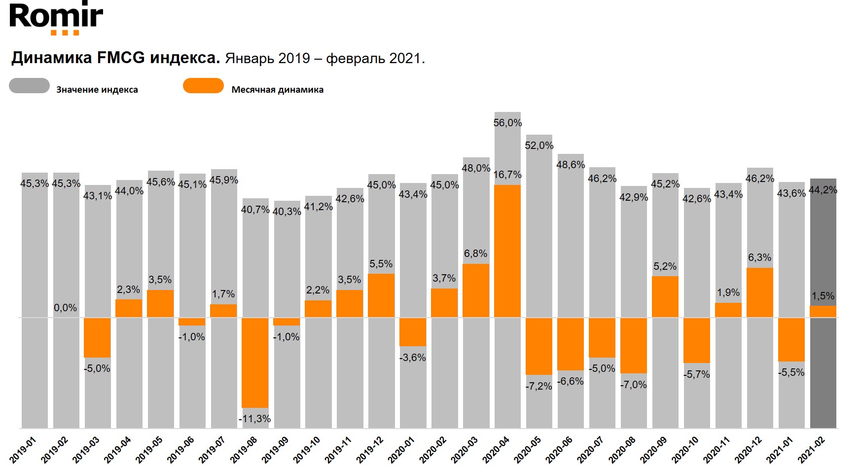 В феврале 2021 года доля трат на FMCG (товары массового потребления) товары составила 44,2%, что на 1,5% больше, чем в январе 2021.