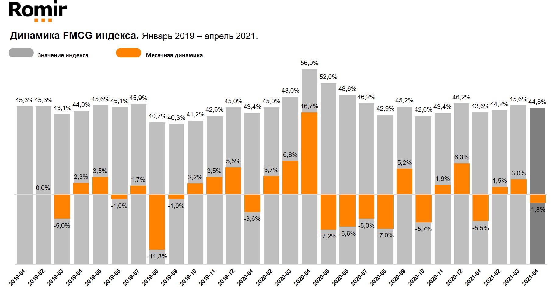 Ромир продолжает расчета FMCG Index – показателя, демонстрирующего динамику доли затрат домохозяйств на продукты питания и непродуктовые категории FMCG товаров (туалетная бумага, шампуни, стиральные порошки и др.) в структуре всех затрат домохозяйства. Размер доли затрат на данный сегмент является одним из факторов, определяющих, к какой категории стран по степени благосостояния относится исследуемое население.