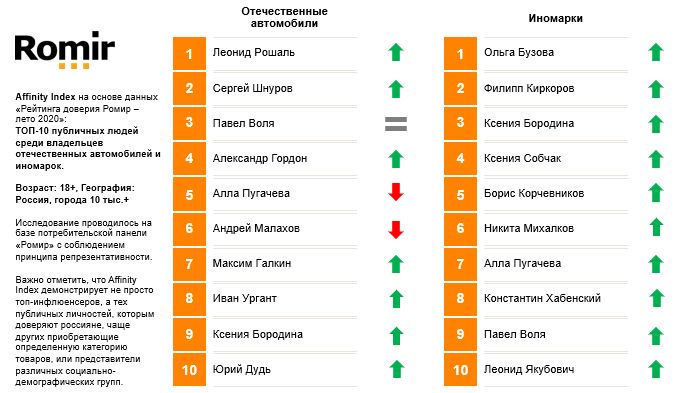 Исследовательский холдинг «Ромир» представляет Рейтинг инфлюенсеров на основе данных «Рейтинга доверия Ромир – лето 2020»*: ТОП-10 публичных людей, которым доверяют владельцы отечественных автомобилей и иномарок. Важно отметить, что данный рейтинг на основе Affinity Index демонстрирует не просто топ-инфлюенсеров, а тех публичных личностей, которым доверяют россияне, чаще других приобретающие определенную категорию товаров, или представители различных социально-демографических групп.
