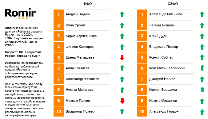 Исследовательский холдинг «Ромир» представляет Рейтинг инфлюенсеров на основе данных «Рейтинга доверия Ромир – лето 2020»*: ТОП-10 публичных людей, которым чаще других доверяют жители Центрального и Северо-Западного ФО. Важно отметить, что данный рейтинг на основе Affinity Index демонстрирует не просто топ-инфлюенсеров, а тех публичных личностей, которым доверяют россияне, чаще других приобретающие определенную категорию товаров, или представители различных социально-демографических групп. Данные даны в сравнении с прошлой волной исследования (весна 2020 года).