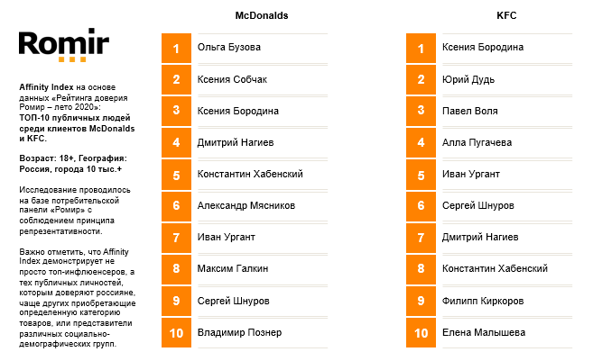 Исследовательский холдинг «Ромир» представляет Рейтинг инфлюенсеров на основе данных «Рейтинга доверия Ромир – лето 2020»*: ТОП-10 публичных людей, которым доверяют клиенты McDonalds и KFC. Важно отметить, что данный рейтинг на основе Affinity Index демонстрирует не просто топ-инфлюенсеров, а тех публичных личностей, которым доверяют россияне, чаще других приобретающие определенную категорию товаров, или представители различных социально-демографических групп.