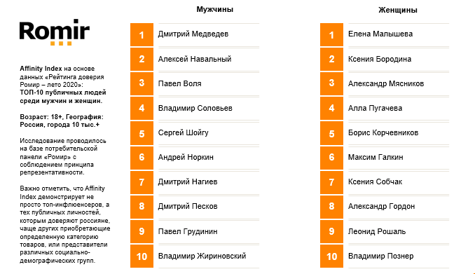 Исследовательский холдинг «Ромир» представляет Рейтинг инфлюенсеров на основе данных «Рейтинга доверия Ромир – лето 2020»*: ТОП-10 публичных людей, которым доверяют мужчины и женщины. Важно отметить, что данный рейтинг на основе Affinity Index демонстрирует не просто топ-инфлюенсеров, а тех публичных личностей, которым доверяют россияне, чаще других приобретающие определенную категорию товаров, или представители различных социально-демографических групп.