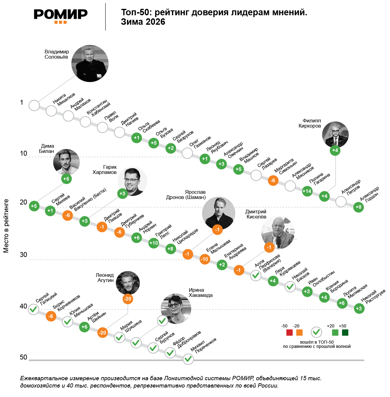 РОМИР представил зимнюю волну рейтинга доверия лидерам мнений. Первое место сохраняет Владимир Соловьёв, оставаясь наиболее доверяемой фигурой исследования.