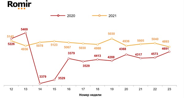 С 7 по 13 июня 2021 года недельные расходы россиян снизились на 146 рублей (это на 3% ниже трат на прошлой неделе) и составили 4893 руб. Тенденция не относится к ежегодному показателю: индекс недельных расходов за год показал рост на 4,3% (на 202 рубля в денежном отношении).