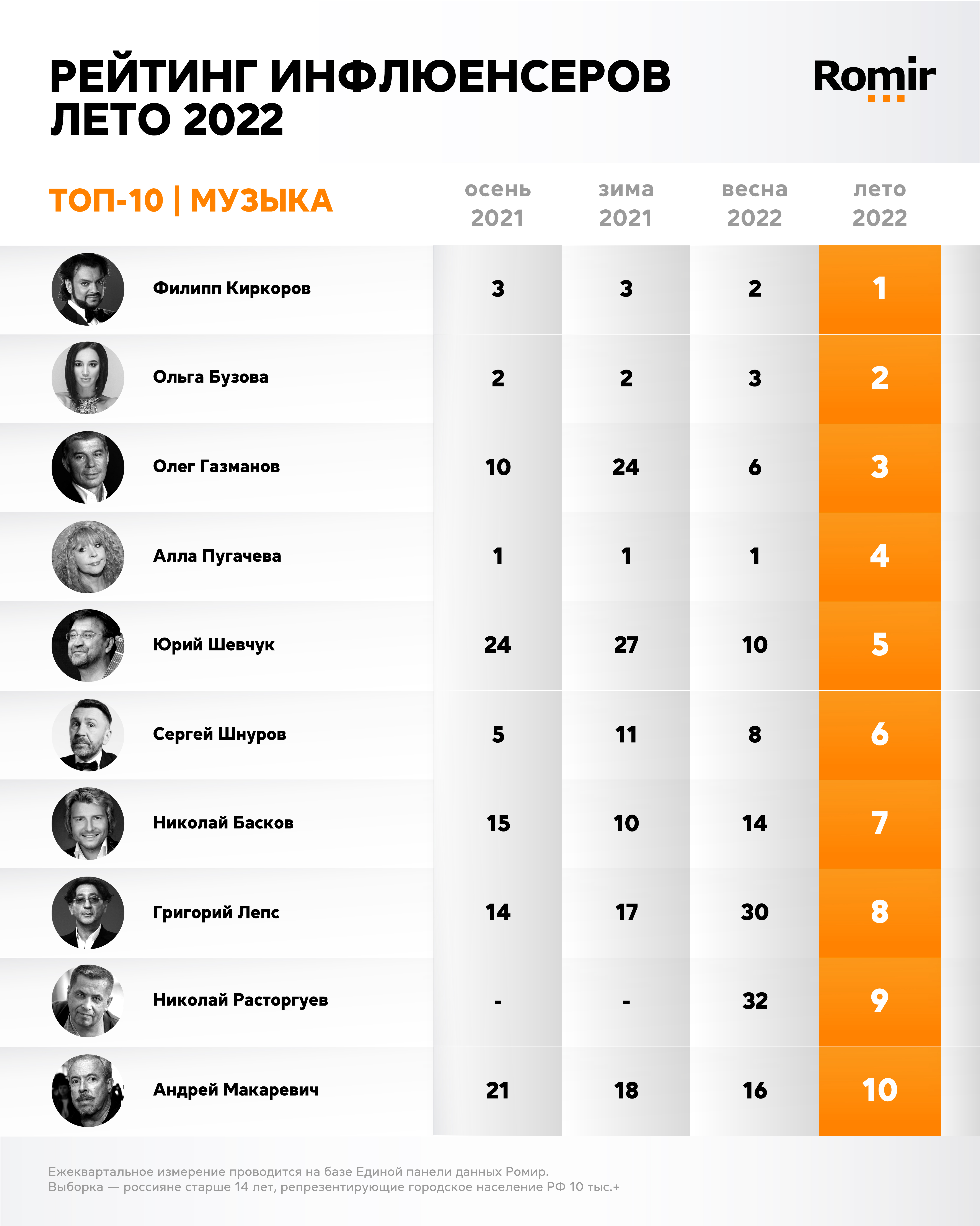 Этим летом первое место в рейтинге инфлюенсеров среди музыкальных исполнителей занял певец Филипп Киркоров. До него несколько сезонов подряд лидерство сохраняла Алла Пугачева, однако, по результатам последнего исследования, исполнительница спустилась на четвертое место. Вернулась на второе место в категории «Музыка» Ольга Бузова. Поднялся с шестого места и замыкает тройку лидеров этим летом Олег Газманов.