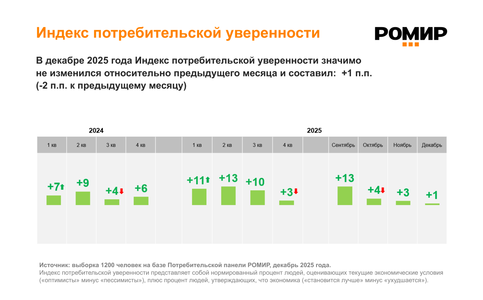 «Индекс потребительской уверенности» отражает баланс мнений участников Потребительской панели РОМИР и строится на двух ключевых параметрах: оценка текущих условий: разница между «оптимистами» и «пессимистами»; ожидания от будущего: разница между теми, кто считает, что экономика «становится лучше», и теми, кто видит «ухудшение». Индекс – результат исследования методом опроса на базе репрезентативной выборки из 1200 человек.
