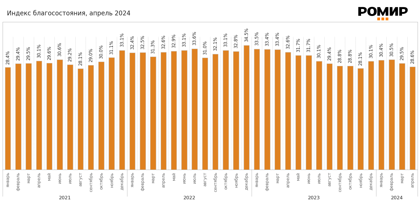 Согласно расчетам, проведенным на основе Единой панели данных РОМИР*, индекс благосостояния в апреле 2024 года получил значение в 28,6%. То есть такова доля затрат среднестатистической российской семьи на продукты питания дома и вне дома в общем объеме месячных трат домохозяйства. По сравнению с мартом текущего года показатель Индекса снизился на 3,1%. Относительно апреля прошлого года Индекс снизился на 12,3%.