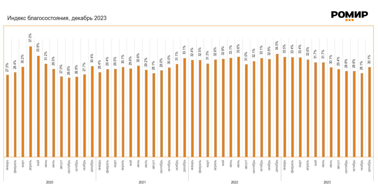 Согласно расчетам, проведенным на основе Единой панели данных РОМИР*, индекс благосостояния по итогам декабря 2023 года составил 30,1%. Иными словами, именно такова была в декабре ушедшего года доля затрат среднестатистической российской семьи на продукты питания дома и вне дома в общем объеме месячных трат домохозяйства. По сравнению с ноябрем показатель Индекса вырос на 7,1%. Годом ранее значение Индекса благосостояния равнялось 34,5%, что на 12,8% выше, чем на данный момент.