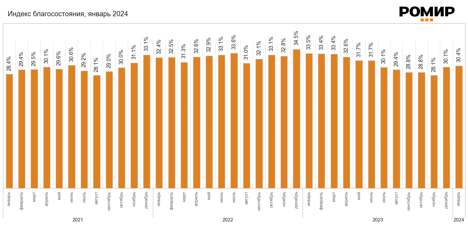 Согласно расчетам, проведенным на основе Единой панели данных РОМИР*, индекс благосостояния в январе 2024 года достиг отметки в 30,4%. То есть такова доля затрат среднестатистической российской семьи на продукты питания дома и вне дома в общем объеме месячных трат домохозяйства. По сравнению с декабрем 2023 года показатель Индекса почти не изменился, прибавив всего 1%. Относительно января прошлого года Индекс похудел на -0,9%.