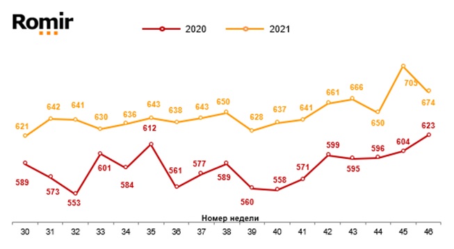 В период с 15 по 21 ноября 2021 года индекс среднего чека россиянина снизился по сравнению с предыдущей неделей. Средняя стоимость одной покупки составила 674 рубля, что на 4% (31 рубль) меньше, чем с 8 по 14 ноября.