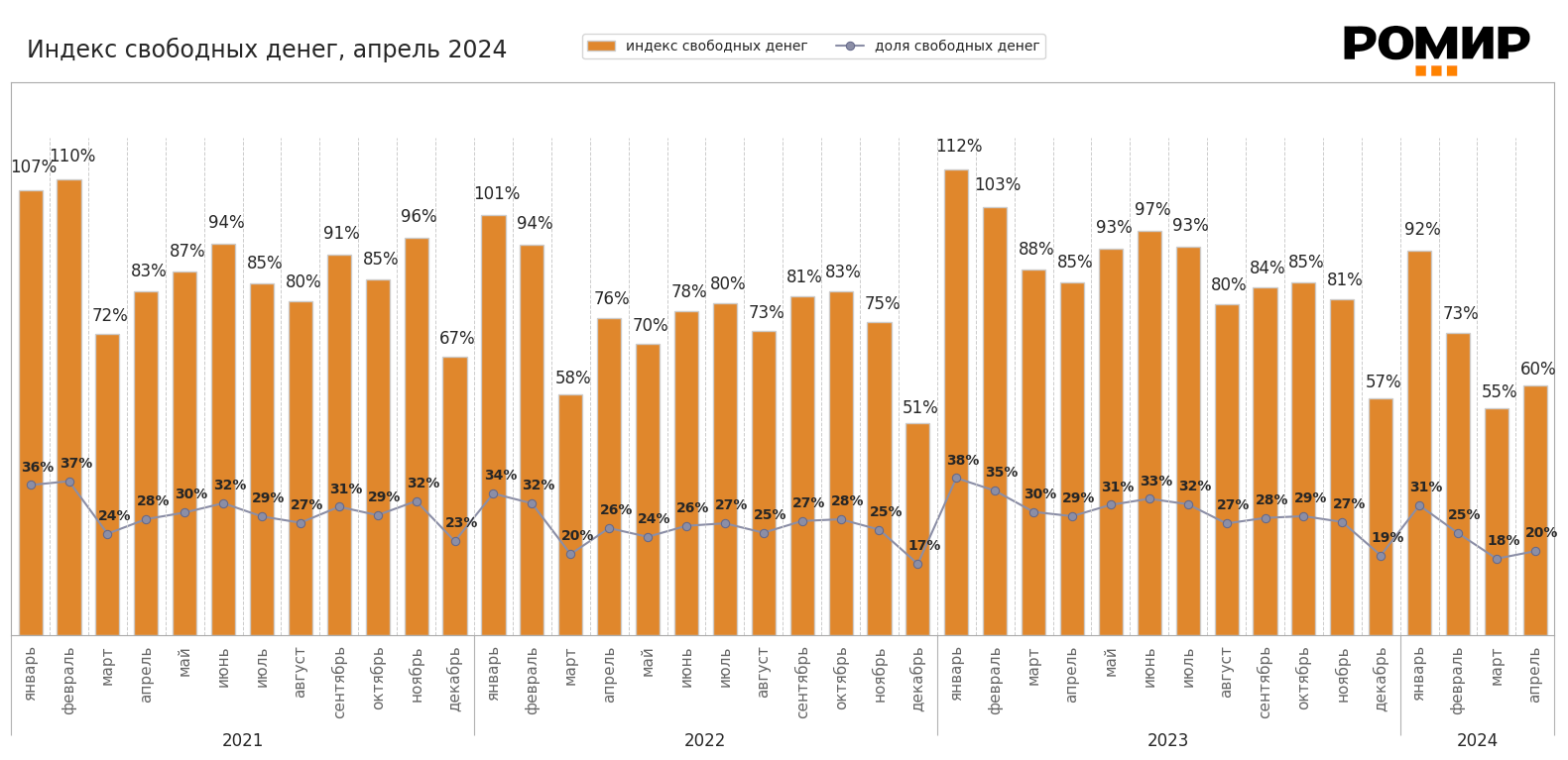 Диаграмма 1. Динамика Индекса свободных денег и доля свободных денег в ДХ, %. Январь 2021 – апрель 2024.