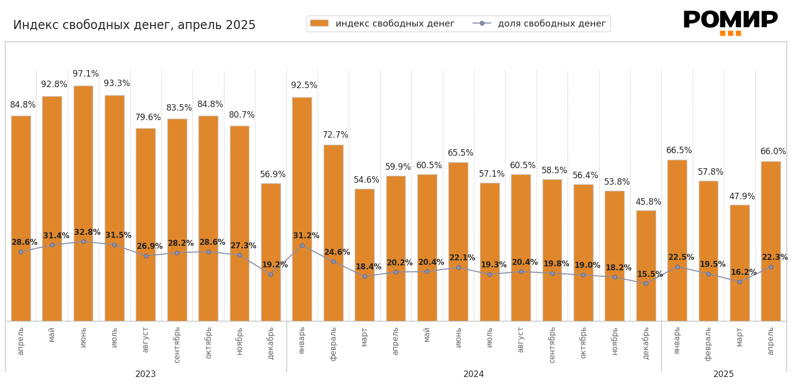 Диаграмма 1. Динамика Индекса свободных денег и доля свободных денег в ДХ, %. Апрель 2023 – апрель 2025.