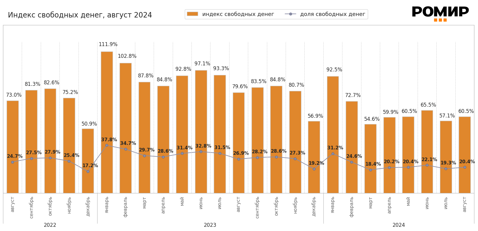 Диаграмма 1. Динамика Индекса свободных денег и доля свободных денег в ДХ, %. Январь 2021 – август 2024.