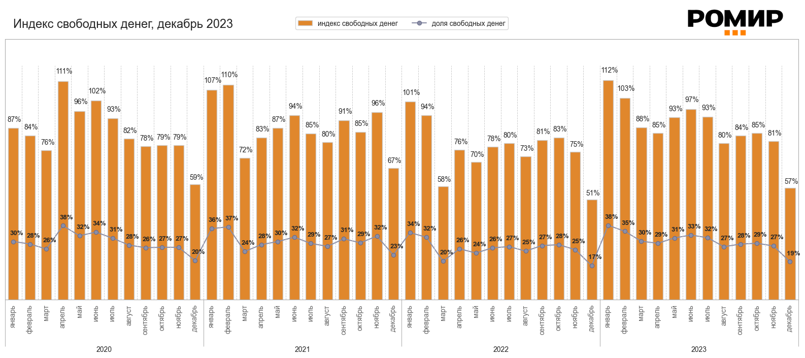 Согласно результатам анализа на основе Единой панели данных РОМИР*, Индекс «свободных денег» в декабре прошлого года опустился до отметки в 57%, сократившись на 24 п.п. по сравнению с ноябрьским значением. Однако он оказался выше показателя за аналогичный период 2022 года, когда ИСД равнялся 51%.