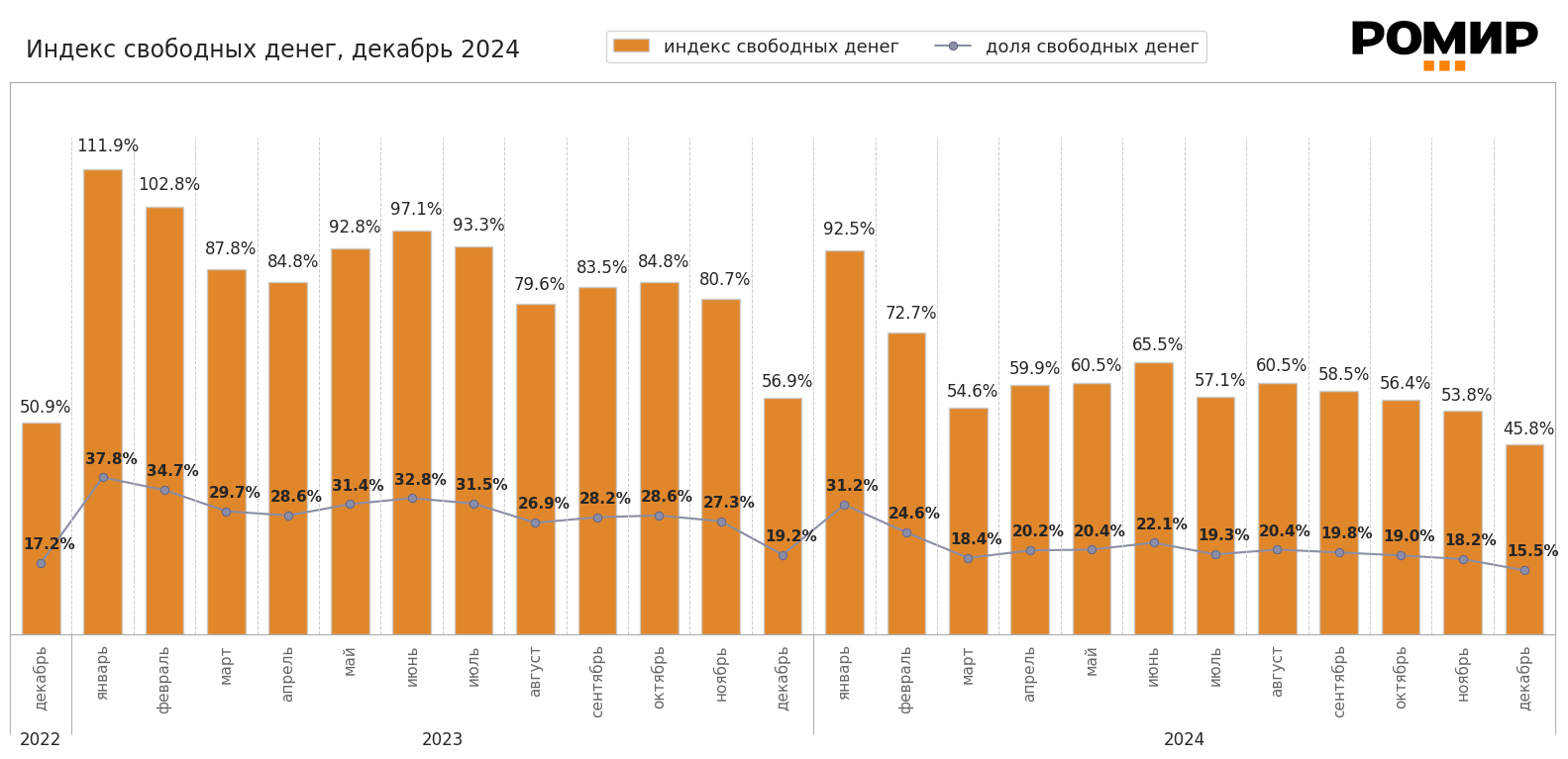 Диаграмма 1. Динамика Индекса свободных денег и доля свободных денег в ДХ, %. Январь 2021 – декабрь 2024.