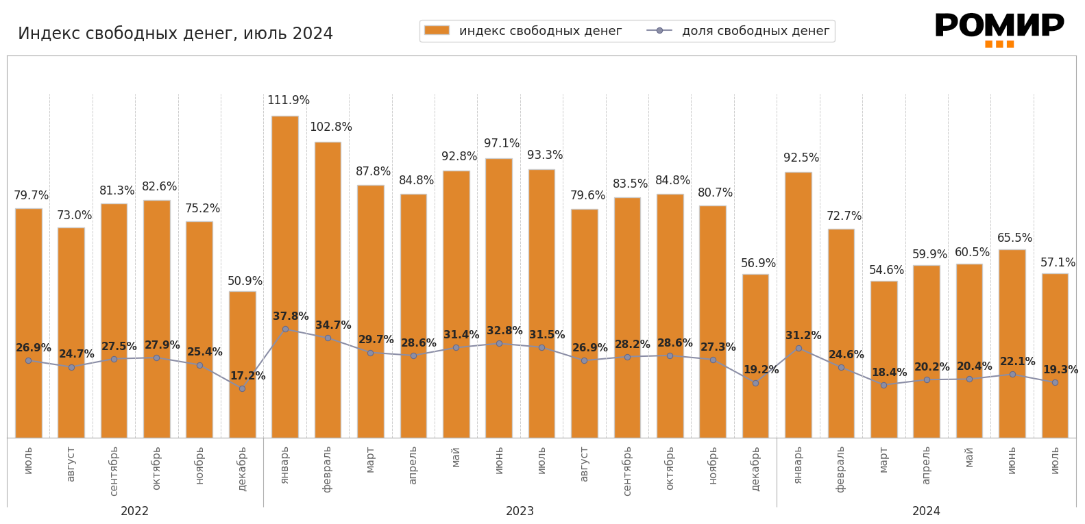Согласно результатам анализа на основе Единой панели данных РОМИР*, Индекс «свободных денег» по итогам июля снизился до отметки в 57,1%. Таким образом, динамика за месяц составила 8,4 п.п. Относительно июля прошлого года ИСД снизился на 36,2 п.п.