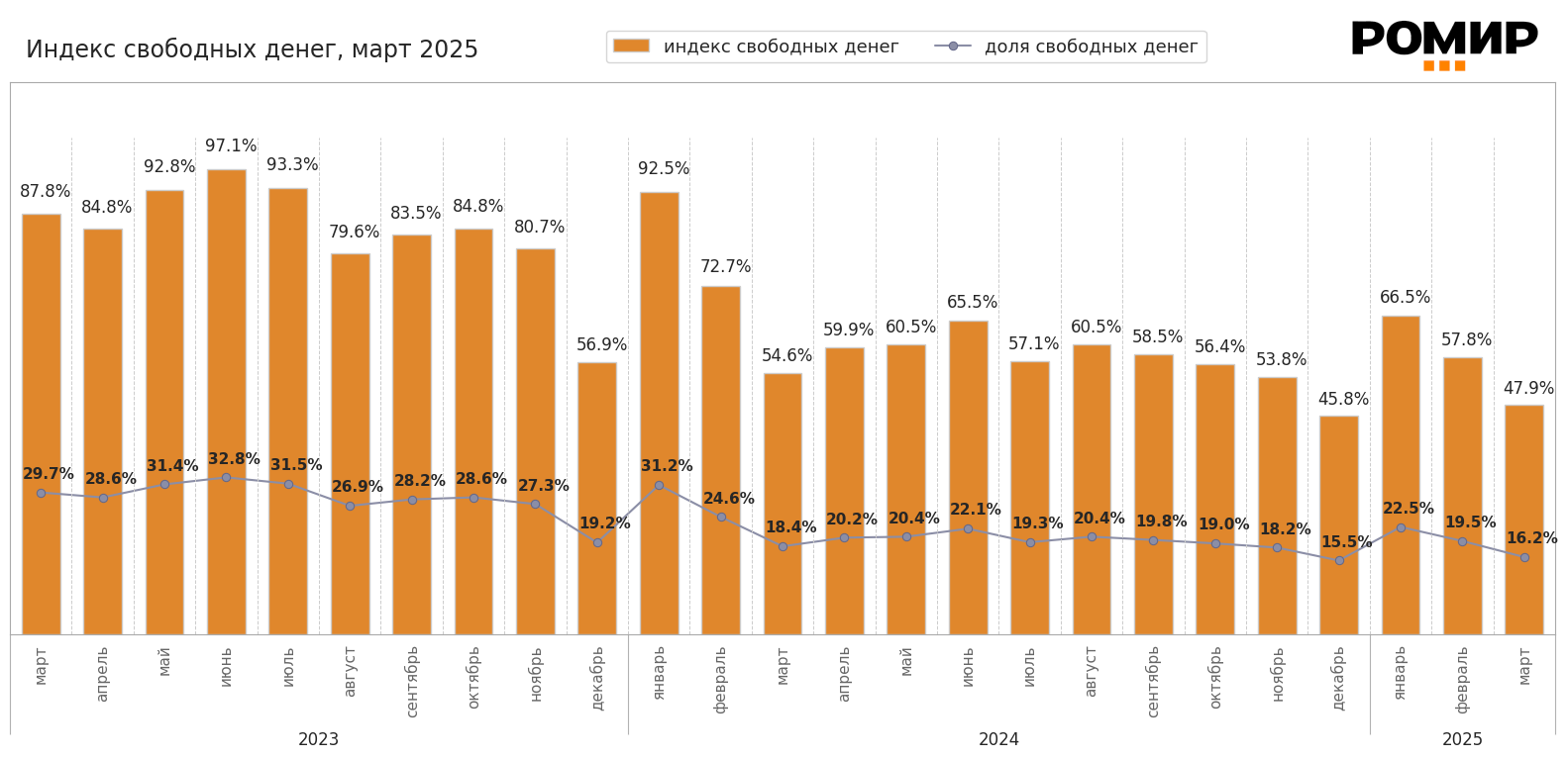 Диаграмма 1. Динамика Индекса свободных денег и доля свободных денег в ДХ, %. Март 2023 – март 2025.