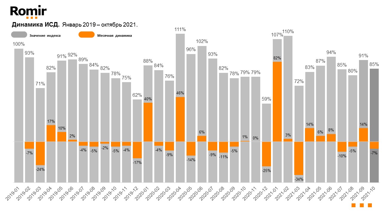 Согласно расчетам на основе данных Romir Scan Panel*, в октябре 2021 года ИСД составил 85%. По сравнению с предыдущим месяцем показатель на 7% ниже. Но по отношению к октябрю 2020-го года (79%) индекс вырос на 9%.