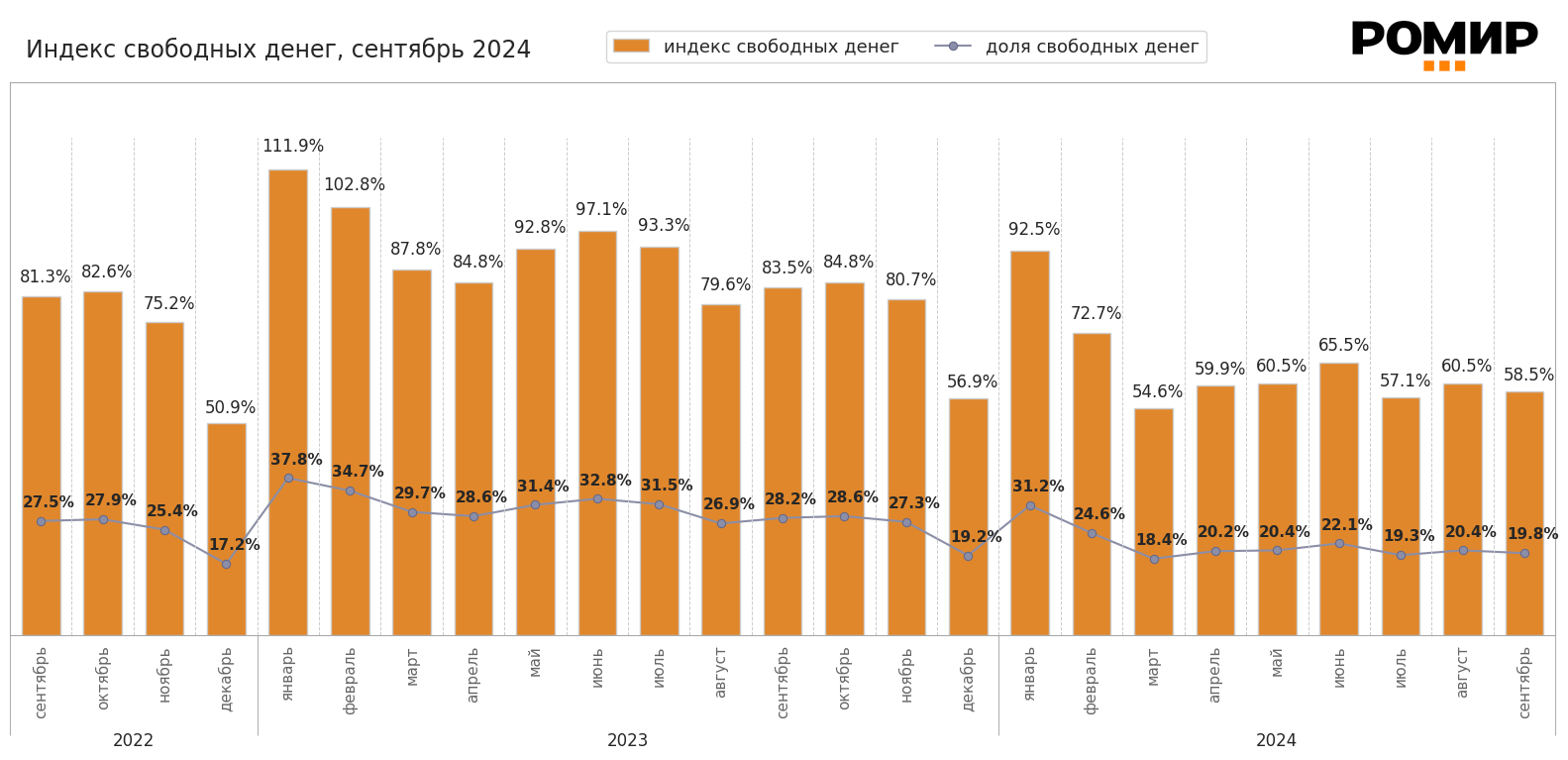 Диаграмма 1. Динамика Индекса свободных денег и доля свободных денег в ДХ, %. Январь 2021 – сентябрь 2024.