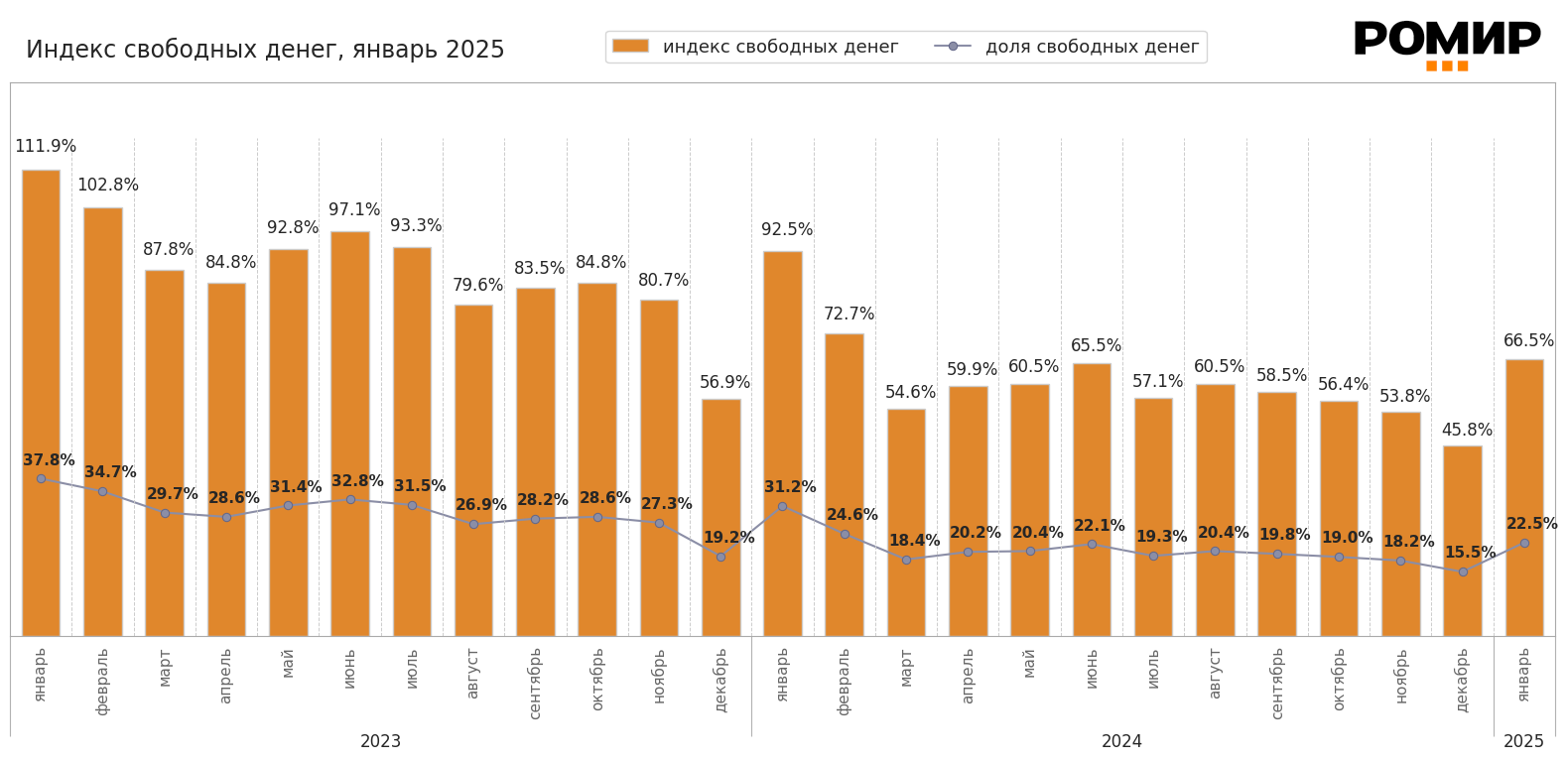 Диаграмма 1. Динамика Индекса свободных денег и доля свободных денег в ДХ, %. Январь 2023 – январь 2025.