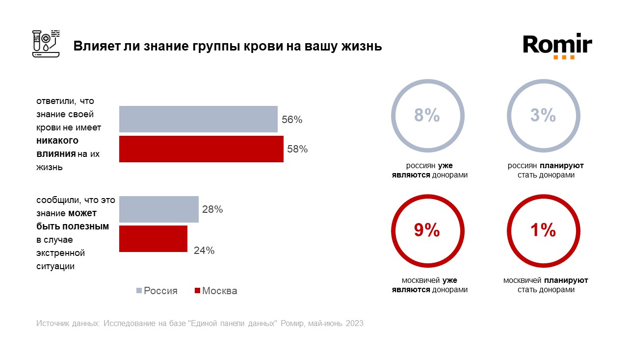 Большинство москвичей (58%) полагают, что знание своей группы крови не влияет на их жизнь, 24% считают, что это необходимо в экстренной ситуации. 9% являются донорами, а 1% респондентов хотят ими стать.
