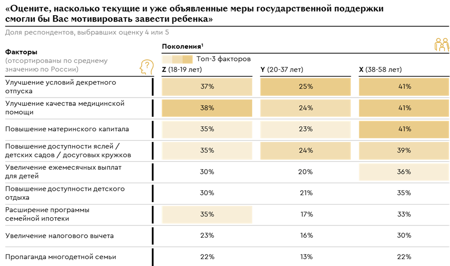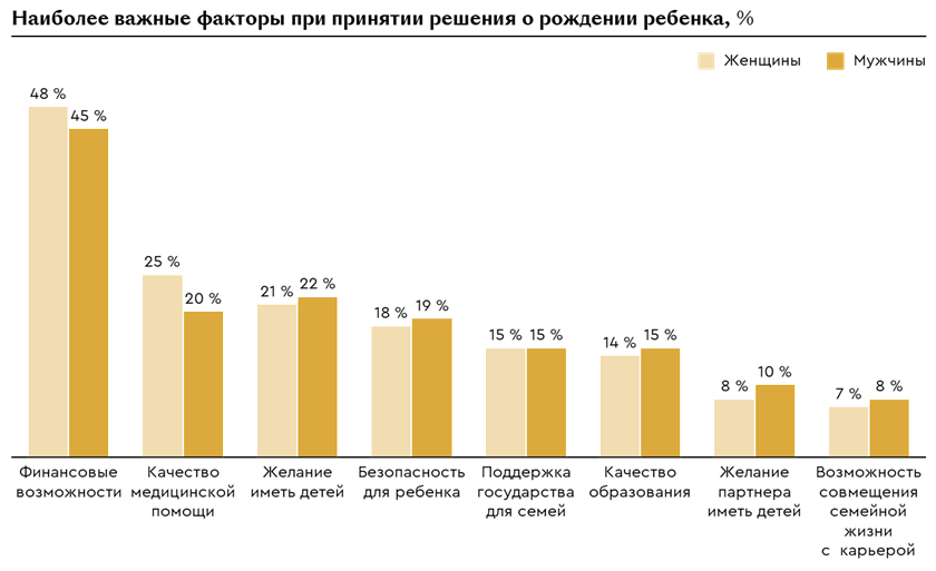 «Для всех респондентов вне зависимости от их возраста, уровня дохода и места жительства главным фактором при принятии решения о рождении ребенка остаются финансовые возможности. При этом факторы, влияющие на решение завести ребенка, практически одинаковы у женщин и мужчин», – комментирует директор Института «Яков и Партнёры» и соавтор исследования Елена Кузнецова. «Для респондентов в возрасте 18–19 лет в число главных факторов входят также качество образования (25%) и возможность совмещения семейной жизни с профессиональной карьерой (25%). А для опрошенных жителей городов-миллионников, за исключением Москвы и Санкт-Петербурга, вторым по значимости фактором является безопасность для ребенка (23%)», – добавила она.
